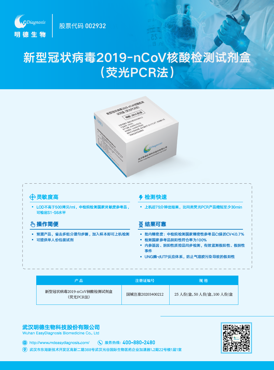 武漢明德生物科技股份有限公司(002932.SZ)成立于2008年,坐落于國(guó)家生物產(chǎn)業(yè)基地——武漢光谷生物城。是一家專業(yè)提供體外診斷試劑及配套儀器(POCT\分子診斷\化學(xué)發(fā)光\血?dú)夥治龅?產(chǎn)品以及胸痛中心、卒中中心、心電網(wǎng)絡(luò)等醫(yī)療服務(wù)的國(guó)家高新技術(shù)企業(yè),湖北省企業(yè)技術(shù)中心,武漢市企業(yè)研究開發(fā)中心。國(guó)內(nèi)高通量POCT倡導(dǎo)者,胸痛中心、卒中中心及遠(yuǎn)程心電網(wǎng)絡(luò)建設(shè)者。目前主營(yíng)業(yè)務(wù)已覆蓋全國(guó)30個(gè)省、直轄市、自治區(qū)近4000家醫(yī)療機(jī)構(gòu),同時(shí)在亞洲、歐盟、南美等多個(gè)區(qū)域?qū)崿F(xiàn)銷售布局。公司于2018年7月10日在深交所掛牌上市,股票代碼002932。